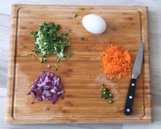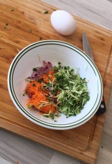3) In a bowl, add chopped fenugreek microgreen, chopped onion, grated carrot, mixed with egg and seasoned with salt and pepper.