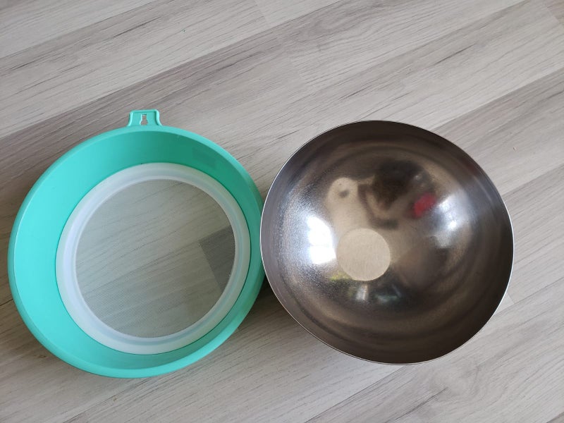 * Initially tried out a strainer but that was curved at the bottom holding fewer seeds. Flour Sieve was flat at the bottom so used it.