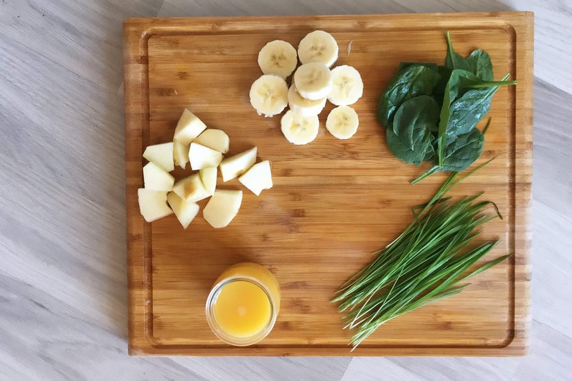 3) In a blender, add the filtered wheatgrass juice, orange juice, banana, apple, spinach, blend it well and enjoy!